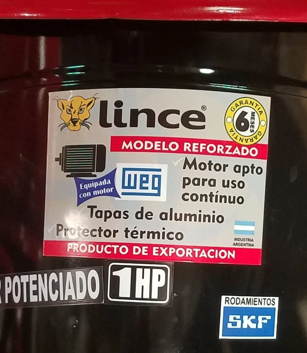 * Motor potenciado WEG 1 HP montado sobre rulemanes, tapas de aluminio. Única con PROTECTOR TÉRMICO que evita que se queme.