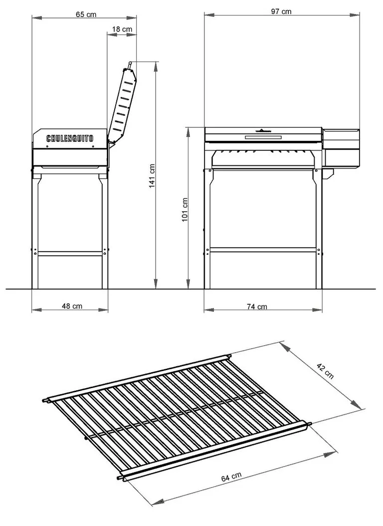 - Emparrillado: Suele ser de hierro redondo enlozado, con un espacio de cocción de aproximadamente 65cm x 43cm.